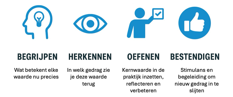 Gedragsverandering vanuit kernwaarden ontstaat niet in een dag. Het is een cintinu proces dat verloopt volgens de volgende fases: begrijpen, herkennen, oefenen en bestendigen: