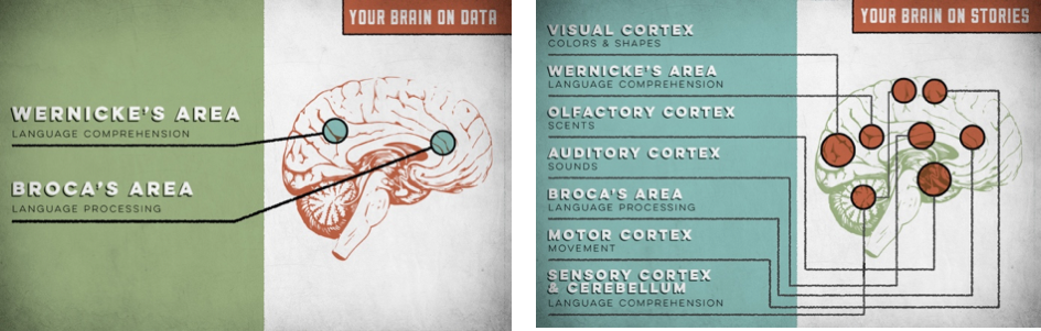 Neuro-onderzoek laat zien dat als je mensen feiten voorlegt ‘roken is slecht’, ‘x% gaat er dood aan’. Dat in het rationele deel van het brein hierop reageert. Op het moment dat je van deze feiten een verhaal maakt, zagen de onderzoekers dat er meer gebieden in je hersenen ‘aan gaan’. Namelijk de gebieden waar emoties worden opgewekt, in het onbewuste deel van je brein. Het gevolg is dat de informatie beter wordt opgeslagen en onthouden. Daarnaast is de kans op gedragsverandering ook groter.
